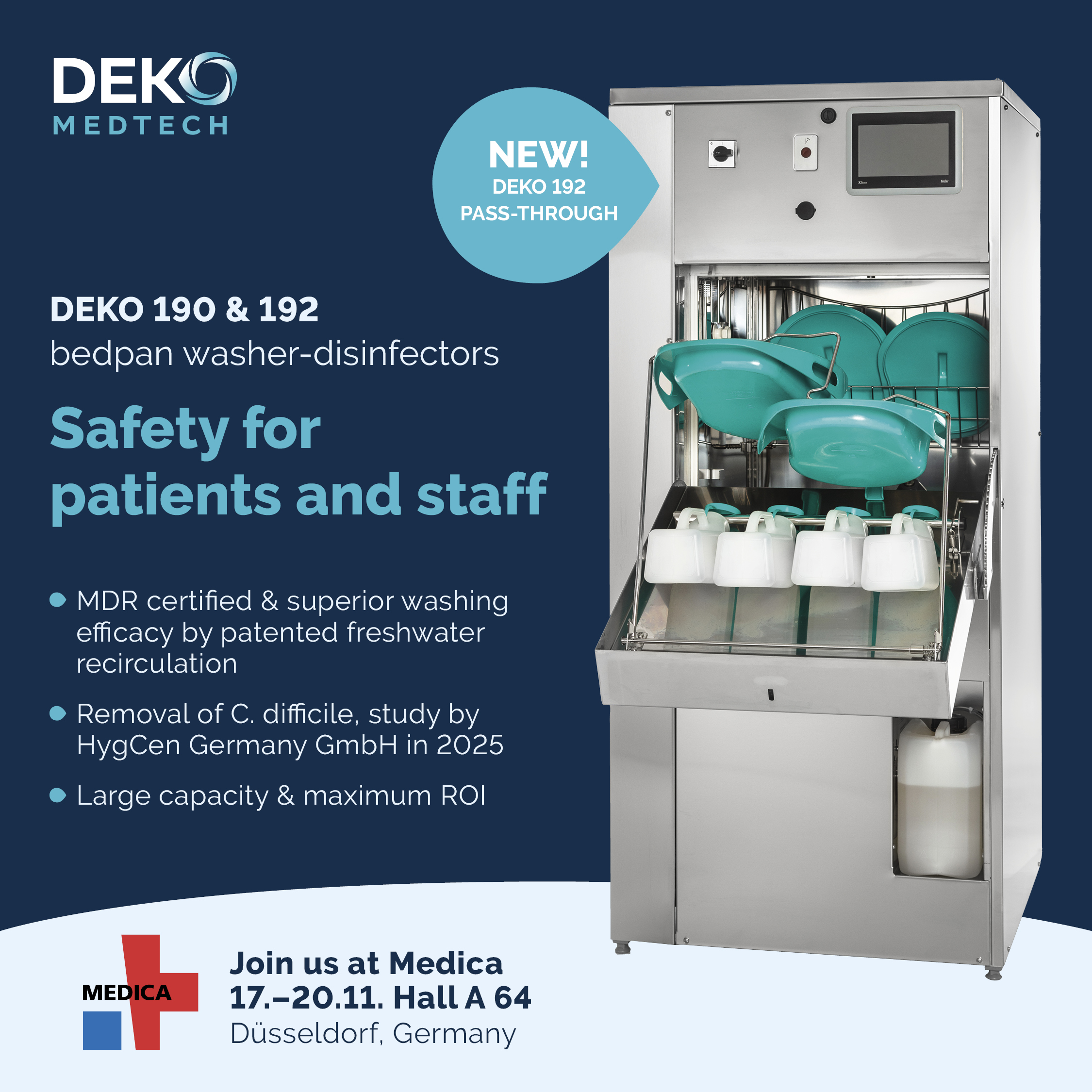 We are proud to launch our new DEKO 192 pass-through bedpan washer-disinfector, designed for facilities requiring strict separation between clean and dirty environments.